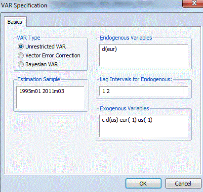 If you look back at that earlier file, you'll find that I used the Toda-Yamamoto (1995) testing procedure to determine that there is Granger causality running from the U.S. series to the European series, but not vice versa.